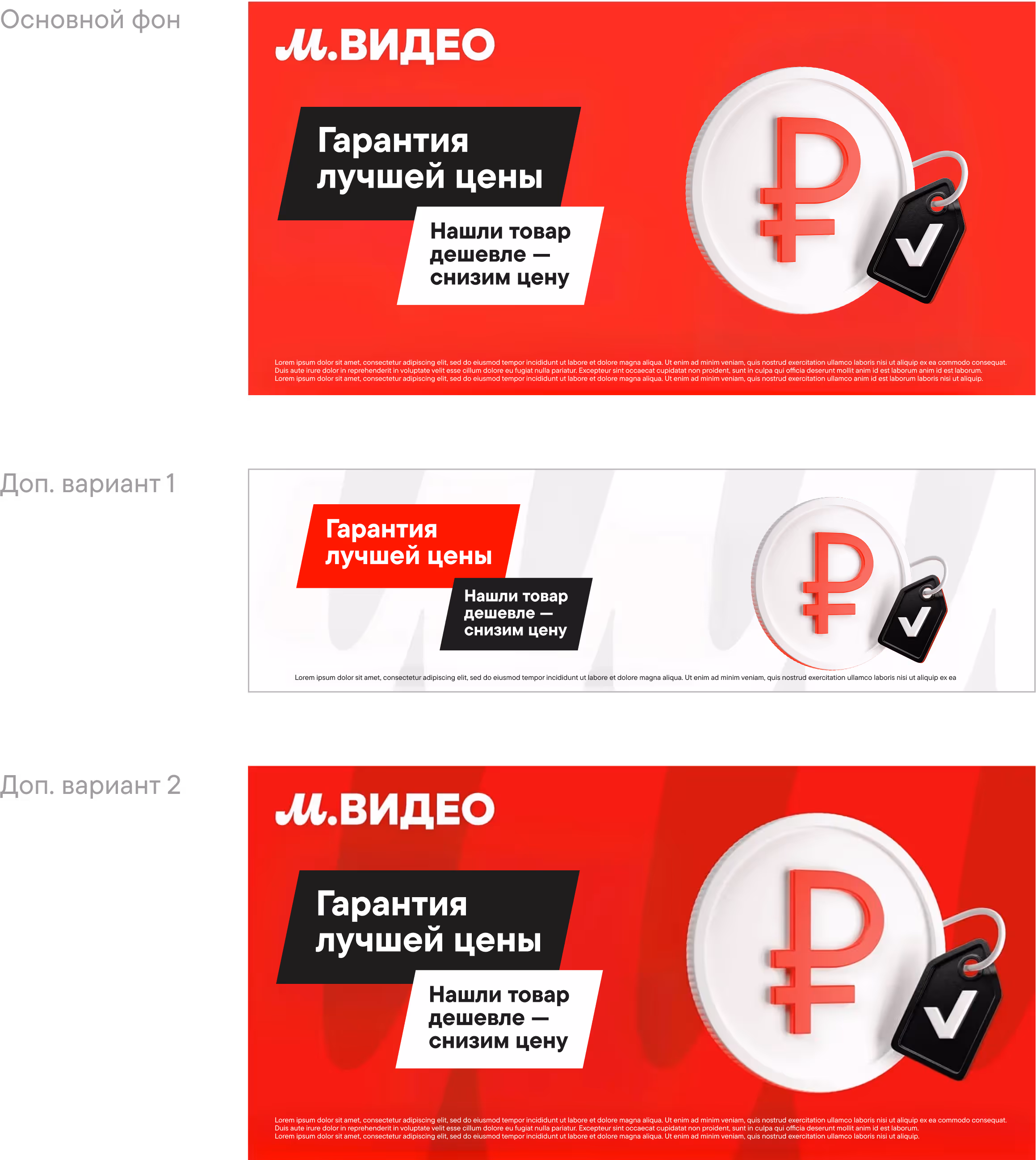 В случаях если на вывеске уже используется логотип М.Видео, на офферах логотип не размещается. Если офферы находятся в конкурентной среде, например, на стене в ТЦ, логотип М.Видео размещается на оффере.